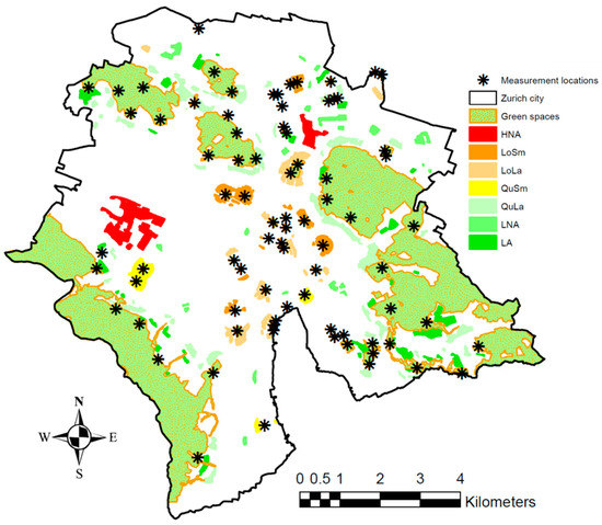 Areas assigned to the seven study groups: High noise exposure at home with no access to GSs (HNA), High noise exposure at home with access to small and loud GSs (LoSm), High noise exposure at home with access to large and loud GSs (LoLa), High noise exposure at home with access to small and quiet GSs (QuSm), High noise exposure at home with access to large and quiet GSs (QuLa), Low noise exposure at home with no access to GSs (LNA) and Low noise exposure at home with access to large and quiet GSs (LA) (cf. Figure 1). As additional information, the 48 GSs included in the study and the 78 measurement locations in these GSs (see Section 2.4) are shown.