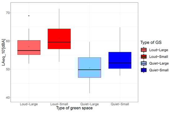 Figure 5 shows the distribution of measured noise exposure (see Section 2.3) between the four types of GSs (loud-large, loud-small, quiet-large, quiet-small). The assignment of GSs based on noise maps was confirmed as GSs classified as loud were characterized by higher noise exposure than those classified as quiet. In addition, the small GSs tended to show higher noise exposure than the large ones, which can be explained by their greater proximity to traffic infrastructure.