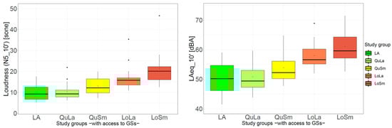 Boxplots of the psychoacoustic and acoustic parameters among different study groups: (left) loudness-N5_10′; (right) LAeq_10′. Study groups “Low noise exposure at home with No Access to GSs (LNA)” and “High noise exposure at home with No Access to GSs (HNA)” are not shown as these have no access to any green spaces. Note the different scales of loudness and LAeq_10′.