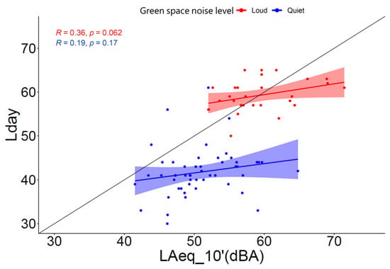 The relation between the Lday obtained from the sonBASE database and the LAeq_10′ obtained from the measurements was assessed with a Pearson correlation analysis (Figure 7). Each data point represents a measurement location and is classified by the type of GS according to the noise level (loud or quiet). A moderate correlation was found for the loud GSs (r = 0.36), where the measurements yielded similar exposure values as calculations, which in turn indicated that road traffic is the dominant noise source. The quiet GSs, in contrast, were characterized by louder measured sound levels and depicted a weaker correlation (r = 0.19). This indicated that sources other than road traffic dominate the noise exposure. None of these two groups showed significant correlations (p > 0.05).