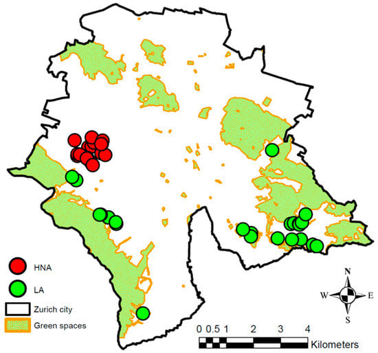 The GSs were identified and selected in a stratified sample using land-use classification data of the Federal Swiss Office of Topography (swisstopo; same data as in [19]). GSs with restricted access (e.g., private/household gardens or playgrounds of schools) or with access requiring payment, namely sport fields (e.g., for soccer and golf), camping grounds, open-air swimming pools as well as the zoo of Zurich, were excluded. Initially, a total number of 124 GSs in the city of Zurich were included in the dataset. These GSs were divided into large (≥10,000 m2) and small (<10,000 m2) and subsequently, into loud and quiet (see details in Section 2.3). Twenty-three loud and 25 quiet GSs were identified; the remaining 76 that matched neither of the two groups were excluded from the study. The final dataset with the four groups of GSs included: (i) loud and large (n = 11), (ii) loud and small (n = 12), (iii) quiet and large (n = 18) and (iv) quiet and small (n = 7).