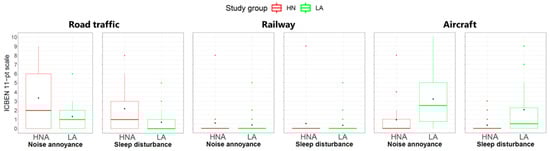 Figure 9 shows the ratings of noise annoyance and sleep disturbance among participants living in the two study groups HNA and LA, separately for the three transportation noise sources road traffic (cars and trucks), railway and aircraft. While no high levels of railway and aircraft noise were expected given the site selection criteria (cf. Section 2.3), the corresponding outcomes were nevertheless inquired about in the questionnaire. Although no significant differences were found between the two groups (p > 0.05), the participants of the HNA group tended to be more annoyed by road traffic, while the opposite was observed for aircraft noise. While the first outcome was expected, the second was rather surprising as aircraft noise levels were kept low in all study areas. This finding might be supported by results from [19] who identified a substantially higher annoyance for inhabitants of green areas compared to people living in areas with less green at a similar aircraft noise exposure. The self-reported sleep disturbance confirmed the trends seen for noise annoyance. Annoyance and sleep disturbance were generally very low for railway noise, which was expected given the low exposure.
