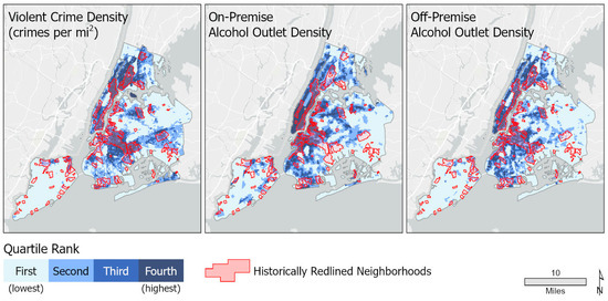 Publicly available datasets are available as follows: Alcohol outlet locations in NYC: NYS Liquor Authority Mapping Project (LAMP). https://sla.ny.gov. https://lamp.sla.ny.gov (accessed on 8 February 2021). Formerly redlined areas in NYC: Nelson RK, Winling L, Marciano R, Connolly N, et al., “Mapping Inequality,” American Panorama, 2017. ed. Robert K. Nelson and Edward L. Ayers. https://dsl.richmond.edu/panorama/redlining/ (accessed on 10 February 2021) [Bronx]. NYC violent crime data: Restrictions apply to the availability of the violent crime data. Although most of the data is available publicly (see: https://compstat.nypdonline.org (accessed on 8 February 2021), to protect the identity of victims, address-level locations of violent crimes are not publicly available. The data may be requested from the NYC Police Department. NYC demographics by US census block groups: Manson S, Schroeder J, Van Riper D, Kugler T, Ruggles S. IPUMS National Historical Geographic Information System: Version 16.0 [dataset]. Minneapolis, MN: IPUMS. 2021. http://doi.org/10.18128/D050.V17.0.
