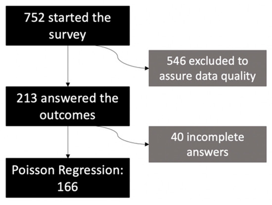As the study was carried out from an online survey, some actions were taken to ensure the quality of the sample data. Likewise, duplicates and discrepant responses were removed, and those who did not answer both questions of the two-step questions as transgenders were not included in the sample. In total, 752 people started the survey, however, only 213 people responded to the outcomes and variables of our study. Of these, 166 were included in the statistical analyses due to complete responses to the scales used in the study. Figure 1 summarizes the participants’ flowchart.