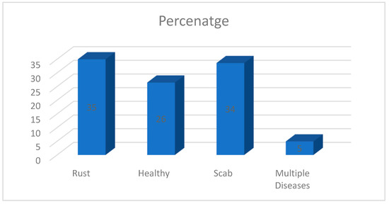 There are 1821 photos of apple leaves distributed proportionally among four labels or classifications, including rust, healthy, scab, and many diseases, in the Plant Pathology 2020-FGVC7 dataset [26], which is openly accessible via Kaggle. There are 289 images in the healthy class, 382 in the rust class, 367 in the scab class, and 54 in the numerous diseases class out of 1092 total photographs. The distribution of the classes is shown in Figure 2.