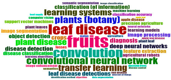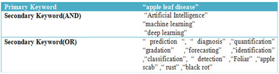 The primary and secondary terms were used to categorise the common terminologies used to describe apple leaves diseases. The search phrases used for this study’s methodology are listed in given Figure 10.