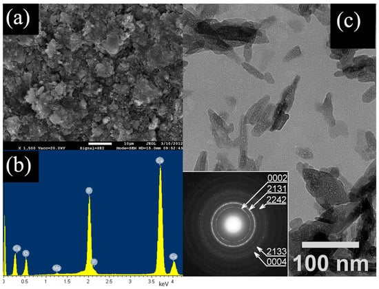 (a) SEM micrographs of hydroxyapatite HA, (b) EDX spectrum of aggregate consisting of hydroxyapatite, (c) TEM image of aggregate of hydroxyapatite nanorods in HAwit SAED ring pattern.