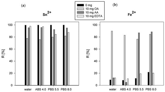 In the case of using Fe2+ ions for reduction with a concentration of 0.2–0.6 mol·dm−3 in solution, the pH after sorption (pHe) ranged from 2.1 to 3.5 depending on the amount of complexing ligand added. The Eh value of the redox potential of the aqueous phase before sorption was in the range of 137–289 mV. The distribution coefficients Kd reached low values in the reducing environment, with a maximum of the order of 102 cm3·g−1. The addition of OA to the system increased the Kd value by increasing the concentration of Fe2+ ions in the aqueous and ABS solution environments, while it did not change significantly in the PBS. The presence of OA in PBS solution significantly affected the values of the distribution coefficient, and the value was in the order of 103 cm3·g−1. In the case of EDTA, the Kd values were very low in all systems. The parameters pHi, pHe, Eh and Kd using the reducing agent FeSO4 are shown in Table 2.