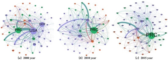 In order to further analyze the virtual water flow problem, this paper visualizes the virtual water trading network. As shown in Figure 1, the importance of a node is measured by the number of shortest paths through that node; the more significant the node, the greater the state’s role in the trade network. The larger nodes are China, the United States, and Germany, which present a tripartite situation. From 2000 to 2015, China’s position in the VWT network continued to rise, becoming a key link in the trade network. In general, the central nodes of the VWT network are divided into two categories: emerging economies such as China, India, and Russia, and industrialized countries such as the United States, Japan, and Germany. From the perspective of virtual water flow, there is often a large trade flow between developed and developing countries. The largest VWT flow occurs between China and the United States, and the VWT flow is as high as 47352.48Mm3. The import and export volume of virtual water in middle-income countries is much higher than in other countries. The VWT data (Appendix B) show that, in 2015, middle- and upper-income countries exported 369.96Gm3 to high-income countries, more significant than the 194.844Gm3 exported by lower-income countries. Therefore, it can be seen that a large amount of virtual water flows from these emerging economies to developed countries.