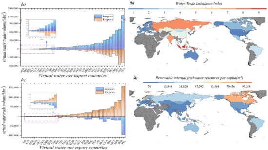 (a) Virtual water import and export volume of virtual water net importing countries/region; (b) virtual water import and export volume of virtual water net exporting countries; (c) WTI value of 62 countries/region (WTI value less than 1 is virtual water net importing country, if it is greater than 1, it is a virtual net exporter of water); (d) The per capita available fresh water in 62 countries/regions.