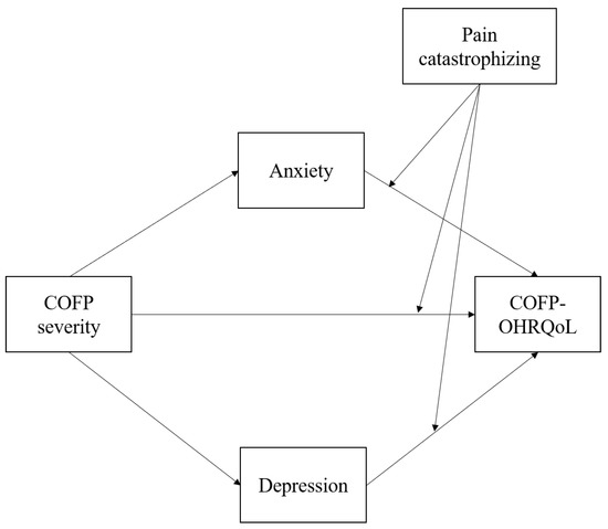 The primary goals of this study were to (1) investigate the associations between COFP severity, anxiety, depression, pain catastrophizing, and COFP-OHRQoL and (2) test a mediation model of the effect of COFP severity on COFP-OHRQoL, wherein the latter is influenced by the former (anxiety and depression) and is, in turn, moderated by the presence of pain catastrophizing. In accordance with previous research, three hypotheses were developed (Figure 1).