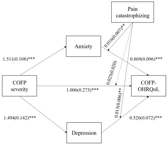 According to Table 5, COFP severity has a positive effect on COFP-OHRQoL (β = 1.006, t = 3.678, and p < 0.001), although there is no evidence that COFP severity interacts with pain catastrophizing (β = 0.025, t = 1.215, and p = 0.224). COFP-OHRQoL and its interaction with pain catastrophizing were both significant predictors of anxiety (β = 0.869, t = 9.075, and p < 0.001; β = 0.016, t = 2.170, and p = 0.030) and depression (β = 0.520, t = 7.183, and p < 0.001; β = 0.013, t = 2.134, and p = 0.033). Figure 2 shows a visual representation of the moderated mediation model.
