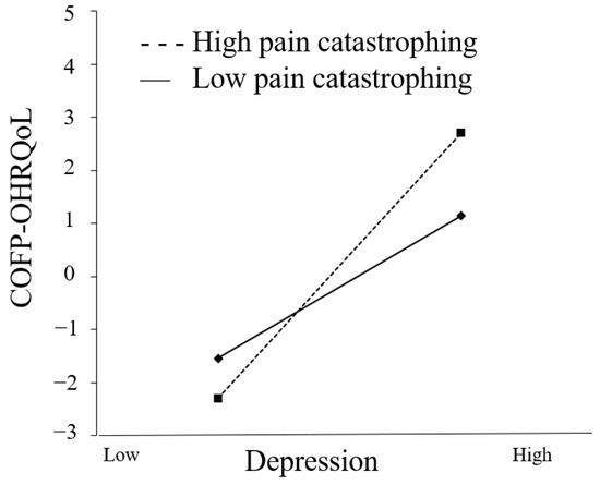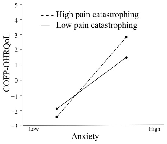 Both Figure 3 and Figure 4 show how pain catastrophizing influences the correlation between depression and anxiety. The COFP-OHRQoL score improved significantly with increasing anxiety in both low and high pain-catastrophizing conditions (β = 1.018, t = 4.612, and p < 0.001; β = 1.609, t = 7.256, and p < 0.001), while depression increased in both low (β = 0.545, t =3.314, and p = 0.001) and high pain-catastrophizing conditions (β = 1.009, t = 5.332, and p < 0.001). There was a statistically significant difference in COFP-OHRQoL between the low and high pain-catastrophizing conditions (β = 0.591, t = 2.108, and p = 0.035); the COFP-OHRQoL score improved by 1.018 and 1.609 standard deviations for every one standard deviation increase in depression. The indirect effects were significantly different between those with low and high pain catastrophizing (β = 0.464, t = 2.043, p = 0.041), with anxiety increasing by 1 standard deviation and the COFP-OHRQoL score increasing by 0.545 (low pain catastrophizing) and 1.009 (high pain catastrophizing).