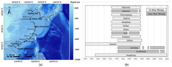 (a) Locations of tide-gauge stations along the southeast coast of China and (b) Gantt chart for the corresponding periods of valid data. The bathymetry in the studied areas is also shown in Figure 1a, which is based on the GEBCO_2021 Gridded Bathymetry Dataset from the GEBCO (The General b=Bathymetric Chart of the Oceans, https://www.gebco.net/data_and_products/gridded_bathymetry_data/ (accessed on 20 December 2022)) website.