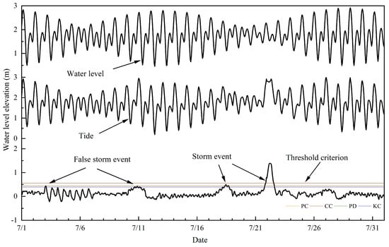 This paper reports the acquisition of the residual-water-level data by carrying out missing-value interpolation, harmonic analysis, reverse air-pressure correction and other pre-processing methods for obtaining hourly tide-level data of tide-gauge stations. Figure 2 shows the relationship between the water level, the astronomical tide and the residuals. In addition, it presents the calculation of the thresholds of the annual residual-water-level data of the above tide-gauge stations by using PC, CC, PD, KC (Figure 2) methods, detection of the storm-surge events and screening using the storm-surge-event-recognition algorithm to determine storm-surge events. The specific method is described as follows.