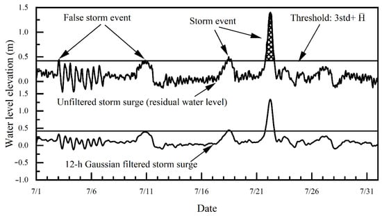 There are two conditions that can influence the detection of storm-surge events. One is errors in the data, and the other is shallow-water effects. There are two basic types of error in data: one is that outliers are significantly higher than adjacent values; the other is the phase shift, which produces a large number of tidal-like fluctuation residuals [,]. However, these errors can be detected easily from the data residuals after tidal components are removed from water-level data. Outliers appear as spikes, completely different from storm surges. Incorrect phase shifts can be easily identified and corrected from the fluctuation pattern of the residuals. At a harbor gauge, water-level data can be affected by strong shallow-water effects. The shallow-water effects can be removed by filtering the residuals using a low-pass (Gaussian) filter. Numerical tests (Figure 3) showed that a 12-hour filter can reduce shallow-water effects. However, this low-pass-filter also suppresses the amplitude of storm surges with a duration of less than 12 h. To reduce shallow-water effects and maintain the original storm-surge information, three steps were taken to identify a storm event. First, possible storm-surge events were identified from the residuals using the threshold criterion described above; next, storm-surge events were also identified from the low-pass-filtered residuals; finally, only the storms detected in both unfiltered residuals and low-pass-filtered residuals were retained.