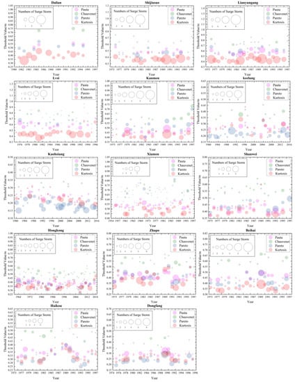Comparison of the thresholds calculated by the four methods at each station and the numbers of detected storm surges. Note: The abscissa represent the year, whereas the ordinate represents threshold (m). Different colors represent different methods: magenta (pink) for PC, green for CC, blue for PD and red for KC. The size of the circle (◯) corresponds to the number of detected storm-surge events and the y-axis value corresponding to location of circle center is the size of the threshold calculated by a particular method for that year.