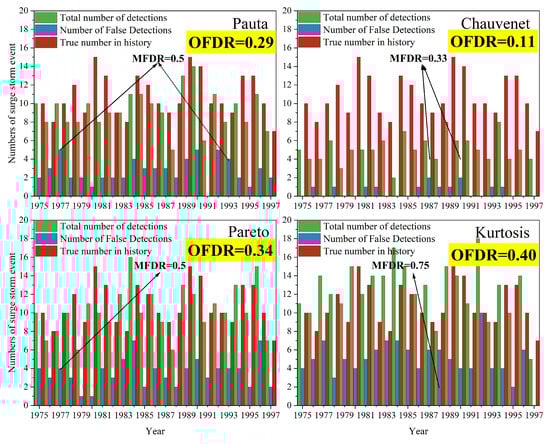 A storm surge may have a wide range of influences and may be detected by multiple tide gauges at the same time. Therefore, it was necessary to combine the annual detection results of storm-surge events at each tide gauge according to the occurrence time, typhoon path and other information, followed by an examination of the statistics on the annual number of storm -urge events detected by the four methods during 1975–1997. By comparing the annual results from the four methods with the number of historical annual typhoon-storm surges, the detection errors for each method were obtained (Figure 6). These error events may have been extratropical-storm-surge events. The results in Figure 6 show that the CC had the lowest MFDR, which indicates that most of the storm-surge events detected by the CC were consistent with the storm-surge events that occurred over time. Because of the 12-hour low-pass (Gaussian) filter and excluding the extratropical-storm surges with gentle storm-surge processes and low residual-water levels by virtue of the high threshold calculated by the CC, most of the storm surges detected by the CC were made to seem more severe. This conclusion is consistent with that in Section 3.1. The KC had the highest MFDR, indicating that more extratropical storm surges may have been falsely detected by the kurtosis method. The greater the number of error events, the lower the detection accuracy of this method. This indicates that the KC has the lowest accuracy, whereas the CC has the highest accuracy.