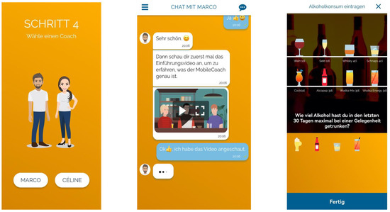 MobileCoach Alcohol (www.mobile-coach.ch, accessed on 10 February 2023) is a mobile app-based program for alcohol prevention that provides individualized coaching by a conversational agent. The native app was developed for both iOS and Android and is available via the respective stores in Switzerland. A web-based administration program enables an overview of all realized coaching dialogs and messages, the administration of the participants’ data, and the answering of the participants’ personal questions during the program implementation.