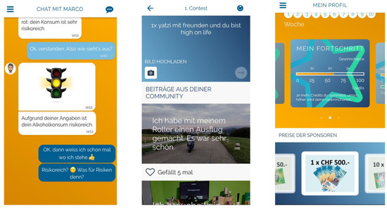 Screenshots from the MobileCoach Alcohol program (left: feedback on alcohol use; middle: contest on beautiful experience without alcohol; right: individual profile displaying progress within the program and potential prizes).