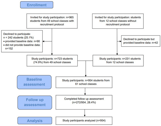Nevertheless, the program could be implemented at a total of eight schools (seven upper secondary and one vocational school) in 61 school classes from February 2021 to July 2022. Figure 3 depicts participants’ progression through the trial. Within 49 school classes with an existing recruitment protocol, 965 students were present. Of these, 723 (59.4%) provided informed consent and registered for participation in the program and the associated study. Another 231 students were recruited from 12 school classes without a completed recruitment protocol, resulting in a total of 954 students from 61 school classes. Online follow up assessment at week 10 was completed by 272 students (28.4%).