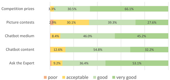 The “Ask-the-Expert” feature, the chatbot medium, and content, as well as the competition prizes, were rated as “very good” or “good” by around or over 90% of the respondent. The picture contests were rated as “good” or “very good” by two thirds of the participants (Figure 4).