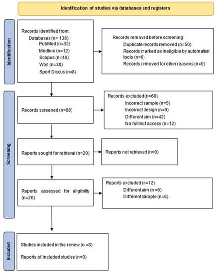 In order to carry out this systematic review, an in-depth search was conducted following the guidelines of the “Preferred Reporting Items for Systematic Reviews and Meta-Analyses” (PRISMA) [] in the following databases: PubMed, Medline, Scopus, Web of Science (WoS), and Sport Discus. The search was carried out in January 2022.