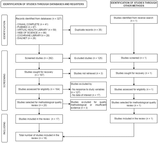 Finally, 164 articles were thoroughly reviewed in their entirety to determine their inclusion in the review. A total of 20 papers were selected for a review of their methodological quality, of which 17 met the stipulated methodological quality. In addition, one new study was identified through a reverse search from other methods that met the selection criteria. Thus, a total of 18 articles were selected.