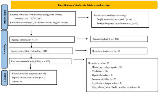 For the purpose of the study, a literature review was performed according to the PRISMA guidelines [12]. A search of the literature was undertaken through the electronic database PubMed, on 2 December 2022. For the aim of the study, the keywords used were (“Exercise” [Mesh]) AND “COVID-19” [Mesh], and filters were added to limit the research to pertain to adolescents (13–18 years) and English reports. Then, the research was downloaded and analyzed.
