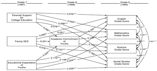 The first structural equation model of longitudinal relationship was conducted to examine the effects of grade-7 family SES, parental support for college education, and educational expectations of youths on youths’ grade-9 educational performance of English, mathematics, science, and social studies grade scores through the mediation of youths’ grade-8 academic commitment while adjusting for youths’ gender, family structure, and ethnic origins (model 1). An excellent model-data fit was obtained: CFI = 1.00, RMSEA = 0.00, and SRMR = 0.00. Figure 1 presents the standardized results, in which grade-7 educational expectations of youths had the strongest significant and positive effects on youths’ grade-9 English, mathematics, science, and social studies grade scores, β = 0.174, 0.148, 0.204, and 0.209, p < 0.001. Moreover, grade-7 parental support for college education and family SES also significantly predicted youths’ better grade-9 educational performance in terms of English grade score, β = 0.076 and 0.065, p < 0.001 and 0.01; mathematics grade score, β = 0.059 and 0.051, p < 0.01 and 0.05; science grade score, β = 0.088 and 0.103, p < 001; and social studies grade score, β = 0.078 and 0.076, p < 0.001. Besides, parental support for college education and educational expectations of youths significantly predicted higher grade-8 academic commitment of youths that in turn significantly contributed to youths’ better grade-9 English, mathematics, science, and social studies grade scores, β = 0.165, 0.136, 0.153, and 0.166, p < 0.001. In addition, the outcomes of youths’ grade-9 English, mathematics, science, and social studies grade scores were significantly correlated with each other substantially and positively, in which the standardized covariances were between r = 0.338 to 0.496, p < 0.001, corroborating valid to converge them on a latent construct of grade-9 educational performance of youths.