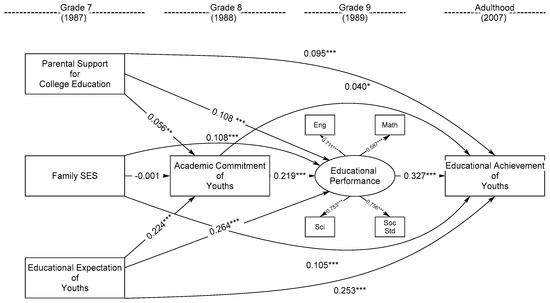 The educational development of youths is pivotal to their health and well-being in later life trajectories [1,2]. Undeniably, family and youths’ individual characteristics are of fundamental importance to shape youths’ educational success in later life. Apparently, family is the most intimate and influential socialization agent contributing to various aspects of youth development including their educational performance and success [3,4,5]. Moreover, recent theoretical and empirical work reports that although youth development is susceptible to the impacts of their proximal socialization environment such as family conditions, youths themselves may cultivate their own development by personal agency [6,7], in which youths who are of higher positive future expectation and motivation would perform better academically and behaviorally. Furthermore, although youth development is a progressive stage from early adolescence to young adulthood, early adolescence of the middle-school years is deemed as the most critical developmental and formative period poised youths to establish their cognitive, behavioral, and educational foundations for future positive development and accomplishment [8,9]. Nevertheless, little existing research has examined the prolonged effects of family and individual contexts of youths in middle-school years on their later educational achievement in adulthood of mid-thirties, which is an important life stage for career development. To fill this research gap, we intend to investigate how family socioeconomic status (family SES), parental support for college education, and educational expectations of youths in grade 7 contribute to their educational achievement in adulthood of mid-thirties through the development of youths’ academic commitment in grade 8 and educational performance in grade 9, stretching a life span of youth educational development from early adolescence to mid-adulthood across 20 years.