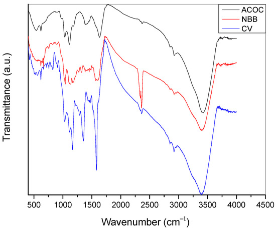 IR spectra of ACOC, ACOC after adsorption of NBB and ACOC after adsorption of CV.