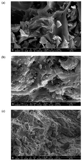SEM analysis was employed to study the surface morphology of ACOC before and after the adsorption of NBB and CV. Figure 3a shows the SEM image of ACOC; several pores with varied sizes were observed on the surface of the ACOC. Figure 3b,c display the aggregation of NBB and CV, respectively, on the surface of ACOC.