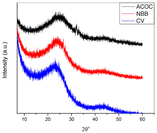 XRD spectra of ACOC before adsorption and after adsorption of NBB and CV.