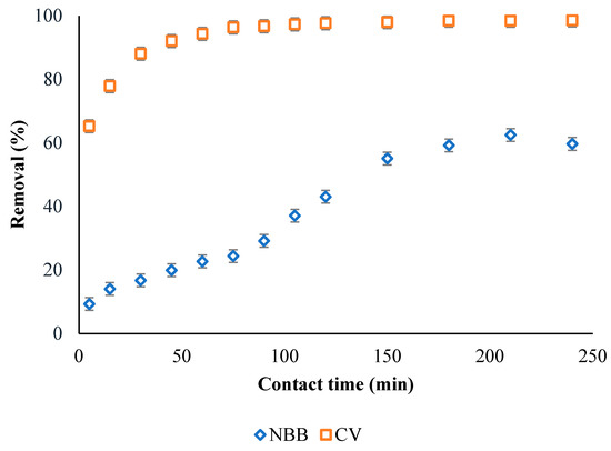 The contact time was investigated up to 240 min, as displayed in Figure 6, with a dye concentration of 100 mg L−1, a temperature of 25 °C, and an ACOC dose of 0.3 g L−1. The adsorption of both dyes is increased with increasing time until it reaches equilibrium after 180 min for NBB, with 60% removal, and 90 min for CV, with 98% removal.