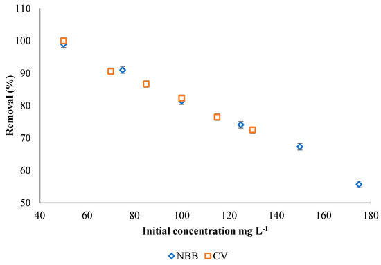 The effect of initial dye concentrations was examined in the range of 50–175 mg L−1 for NBB (mACOC = 0.05 g) and 50–130 mg L−1 for CV (mACOC = 0.02 g). As Figure 8 shows, the removal efficiency of both dyes is decreased as the initial concentration of the dyes increases, and this may be attributed to the limited number of adsorption sites that are present on the ACOC surface [7].