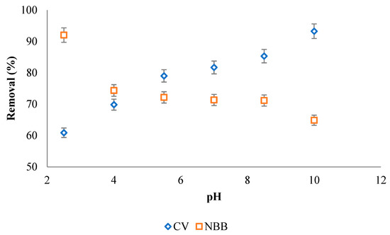 The effect of pH on 100 mg g−1 NBB and CV removal efficiency by ACOC (T = 25 °C, V = 100 mL, mACOC is 0.050 g for NBB and 0.020 g for CV).