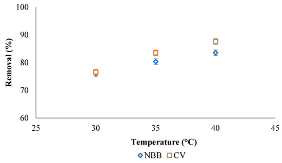 The effect of adsorption temperature is examined at a temperature of 30, 35 and 40 °C for 100 mg L−1 of the NBB and CV dyes, as shown in Figure 10. The removal efficiency of both dyes increases as the adsorption temperature increases. The results indicate the endothermic nature of the adsorption reaction for both dyes onto ACOC surface.