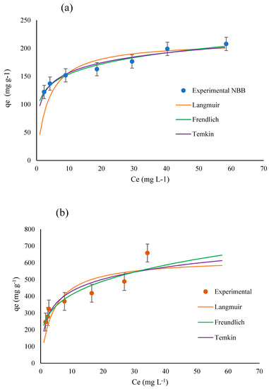 Adsorption isotherm models (Langmuir, Freundlich and Temkin) fitted to experimental adsorption of (a) NBB and (b) CV.