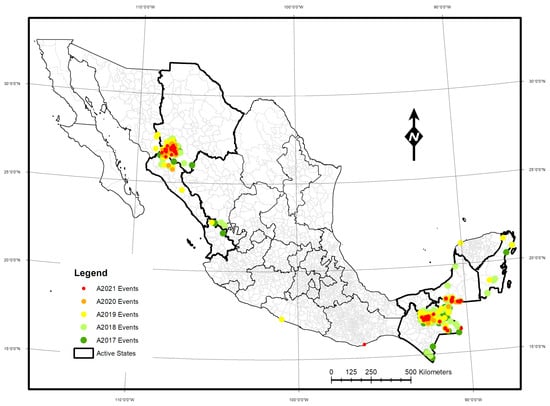 Malaria is a disease caused by parasites of the genus Plasmodium vivax and falciparum. It is transmitted by female mosquitoes of the genus Anopheles and the species pseudopunctipennis, albimanus, vestitipennis, darlingi, and punctimacula. In 2021, it was estimated that there were more than 247 million cases of malaria in the world, with Africa accounting for 95% of all cases. In the region of the Americas, the WHO estimated that there were more than 597,000 cases []; in addition to presenting a lower number of cases, there was also a decrease in the geographical coverage of regions with local transmission. In Mexico in 2020, 339 confirmed cases were recorded, according to the epidemiological bulletin of the National Epidemiological Surveillance System (SINAVE) []. In recent decades, several strategies have been implemented in Mexico, and each one has had a significant impact on reducing malaria cases. Currently, transmission continues in seven of Mexico’s 32 states (Figure 1).