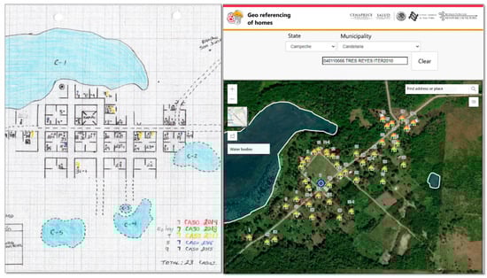 In July 2020, the implementation phase of the system began in seven states; in September 2020, the implementation of the GISTEM began in the remaining 25 states, where only entomological surveillance activities were carried out. Implementation took place in three stages. The first stage consisted of training users to manage the “Validation of locations” geographical tool, which serves to validate the name and official geographical identification code and the spatial location of each location that belongs to a focus. In the second stage, users were trained in the management of the geographical tool “Georeferencing of Houses and Aquatic Systems” to locate and assign the identification of each house (ID-CNEP) on a Web map (Figure 4). The aquatic systems were subsequently georeferenced; with this tool, it was possible to transfer the information from the field sketches to a database. The third stage consisted of training the technical staff to record the data of the components of “Detection, Diagnosis and Treatment”, “Entomological Surveillance”, and “Control Actions” systems.