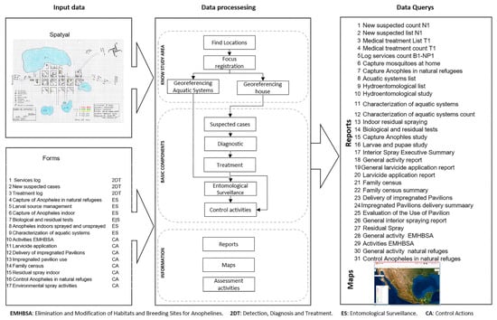 In the detection, diagnosis, and treatment component, there is information on the activities that the brigade carries out in relation to the detection and active or reactive notification of cases, training for the reporting population, and detailed registration of the treatment administered to positive cases of malaria. This component has three data record formats: (a) service activities log (B1); (b) notification of probable cases (N1); (c) treatment record log (T1). The entomological surveillance component contains six data-recording forms for these activities: (a) recording of adult Anopheles with human bait in housing; (b) recording of adult Anopheles in a natural shelter; (c) recording of adult Anopheles in sprayed and unsprayed housing; (d) characterization of aquatic systems; (e) study of larvae and pupae; (f) biological testing. The third component was called “Control Actions”; in this component, all the chemical and environmental control activities that are carried out in the house, aquatic systems, and natural shelters are recorded. This component includes the following formats: (a) residual intra-domiciliary spraying; (b) flag delivery registration; (c) evaluation of the use of pavilions; (d) environmental nebulization activity; (e) elimination and modification activities of hatcheries and habitats of Anophelinos (EMHCA), with community participation; (f) application of larvicides; (g) control of adult Anopheles in natural shelters.