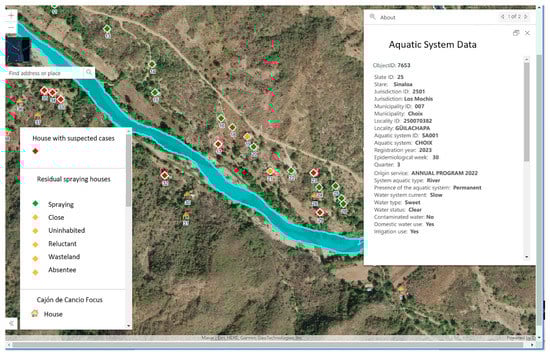 The GISTEM spatial data output is accomplished through a geographic Web information system. The geographic viewer (GV) contains a query panel, so users can structure queries to see the characteristics of a focus for a period of time (quarter) and the location and environment of populations, roads, and orography, among other physical features. This is possible thanks to a mosaic of Web satellite images developed by the Environmental Systems Research Institute (ESRI). Users can also see the homes in each location and the aquatic systems of the environment duly identified and characterized. The GV shows the information that was originally in the field sketches; therefore, it is very useful for planning tasks. The consultation panel allows users to view homes with Rapid Diagnostic Tests (RDT), probable cases, treatments, and control actions. It also shows the entomological information and control actions for aquatic systems per quarter; additionally, the GV has a direct query function on the map elements; that is, with one click, a pop-up window with individual data is displayed. For example, if the query is about actions, the pop-up window contains, in addition to the geographical location and dates of the intervention, the type of insecticide used, characteristics of the application equipment, fuel consumed, number of rooms, and annexed rooms. If the aquatic system has not been worked, the reason why it was not worked is shown. Figure 6 shows a view of Güillachapa town that belongs to the “Cajón de Cancio” focus. This town is located on the edge of the Choix River; it has 51 homes and 4 aquatic systems. This figure shows the location of the dwellings: the red diamonds indicate probable cases, the dwellings where control actions were carried out through “intra-domiciliary spraying” are marked with green diamonds, and the dwellings without control actions are marked with yellow diamonds.