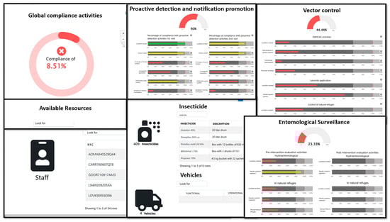 As malaria transmission decreases, it becomes concentrated in specific areas, and the frequency of reporting increases; however, the use of information also increases due to the need for monitoring and evaluation of program activities []. A focus manager is a tool that calculates compliance assessment indicators of the operational activities in the active focus. The decision maker in the health jurisdiction can plan their control activities based on the information from the GF in order to determine specific courses of action. Dashboards always allow the most important information for decision-making to be observed quickly and easily. This is the case of the NIMR-MDB in India, which allows the visualization of malaria epidemiological data []. Through this dashboard, researchers and policymakers can perform epidemiological data analysis for the development of malaria control strategies in India.