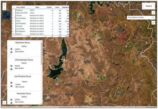 The GV shows that, in the state of Sinaloa, the active transmission zone is currently to the north of sanitary jurisdiction number 1, which is located in the northwest of the state, bordering the states of Chihuahua and Sonora. In this area, 10 foci are being monitored: 2 active and 8 residual; in these foci, there are 60 localities, 7109 homes, and 16,878 inhabitants (Figure 8).
