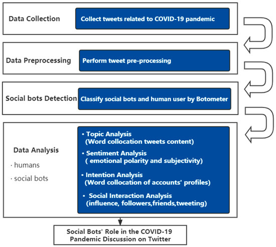 The global pandemic of COVID-19 has not only seriously affected the economic situation and people’s lives and health around the world, but has also spawned an “infodemic”. A large amount of unexpected, mixed true and false information has spread rapidly and massively on social media, making panic and anxiety. False information has been widely accepted and even disseminated, forming a misleading and coercive attitude in public’s cognition and ideology. Inaccurate and even dangerous information has been widely spread on social media, crazy conspiracy theories are infecting the Internet, and hatred is spreading virally [1]. This shows that, compared with the “new coronavirus”, the “public opinion virus” is even more terrifying, spreading even faster and wider, and having a stronger impact on public perception [2]. Social bots, as a new intelligent technology, have gradually penetrated the online social media space and even become the agents of these “opinion viruses” [3]. They hide behind social media accounts, integrate codes to simulate humans, and produce and disseminate content related to public health. Some studies have shown that the activities of social bots led to hatred and extremism during the COVID-19 pandemic [4,5].