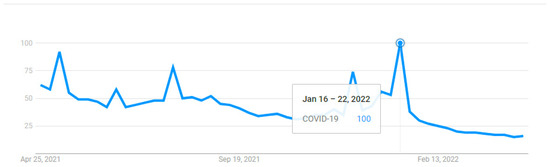 Among social media platforms, Twitter is a popular public communication network that provides instant access to a vast amount of bottom-up created data covering various topics of interest. Researchers are considering social media particularly Twitter for various studies due to the rich spatial, temporal, and social attributes of these data. Therefore, Twitter was chosen as the data collection source. Besides tweets, information about time, location, and users is also attached, which is beneficial for a variety of research reasons. Social media users often anchor their tweets to topics with specific hashtags, thereby triggering users who follow the same topics to engage in online communication and public discussion on beaconed topics. Therefore, we created a search application using the Python package Tweepy to collect relevant tweets. Twitter provides an application programming interface (API) for browsing and streaming tweets made by users. The API allows searching for tweets produced at a given time by setting the start and end search dates, ensuring that the tweets are searched within one week of the search time. Users can look for tweets based on their appearance or keywords. The search criteria may be restricted to just capturing tweets with specific characteristics (such as tweet language). Searching also allows retrieving specific fields of a tweet instead of the entire tweet. Due to the long time period of the COVID-19 pandemic, we identified significant time points in recent years by searching Google Trends for the keyword COVID-19 (as shown in Figure 2). We found that social media users continued to follow topics related to the COVID-19 pandemic, and that the focus largely covered all countries around the world. Therefore, we used #COVID-19 as a key topic and used the Twitter Standard Search API to identify tweets about the COVID-19 pandemic outbreak in English.