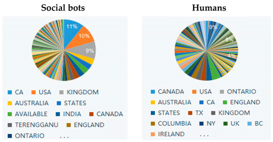 We conducted the analysis on a sample of 54,919 tweets, 14,499 tweets (26.4%) originated from social bots, 38,774 tweets (71.21%) from humans, and there were 1648 (2.39%) tweets for which the bot score was not available, so we set them as unknown users (not included in the analysis), resulting in 53,608 tweets being included in the analysis. The average text length of these tweets was 110, slightly longer for human users than for social bots. By analyzing the location of accounts, we found that humans and social bots accounts are located in similar regions, mainly in Canada, United States, United Kingdom, Australia and India (as shown in Table 1). However, the geographical distribution of human accounts is more dispersed, while the regional distribution of social bots is more concentrated, with more than 30% of social bots’ accounts located in Europe and the United States (as shown in Figure 3).
