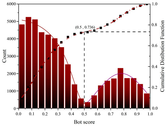We visualize the overall distribution of all user bot score detections through frequency distribution histograms and cumulative distribution functions (as shown in Figure 4). Among them, the average bot score of all accounts is 0.35, with 0.03 mode, and 0.26 median. The average level of all the accounts is close to the upper tertile, and the distribution and aggregation boundaries between humans and social bots are relatively distinguishable. Taking bot score = 0.5 as the dividing line, non-social bot accounts (score below 0.5) accounted for 73.6%, and social bots accounted for 26.4%. To a certain extent, it also shows that using 0.5 as the criterion for distinguishing between human and social bot accounts is suitable.