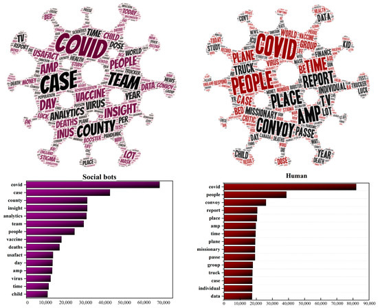 Using natural language processing, we analyze high-frequency words, topics, and sentiment of tweets posted by social bots. We use R language to process the raw data. By analyzing tweets content, we find that social bots and humans focus on COVID-19 pandemic and they both seem quite passionate about this topic. However, the focus of the two is also different. Specifically, humans are more concerned about topics that are closely related to human beings, such as people’s lives, inter-city mobility, and drug treatment. Words, such as “people” and “convoy”, have become the focus of humans. Social bots are more concerned with news topics related to the real-time evolution of the epidemic, such as confirmed cases, mortality, data analysis, and vaccine research. Words, such as “case”, “country”, and “analytics”, are the focus of social bots. Figure 5 shows the word cloud and the top 15 high-frequency words of the contents published by humans and social bots. Topics for humans are scattered and evenly distributed, while topics for social bots are ladder-like, which shows that the topics that humans care about are broad and scattered, while the topics that social bots care about are relatively few and clustered.
